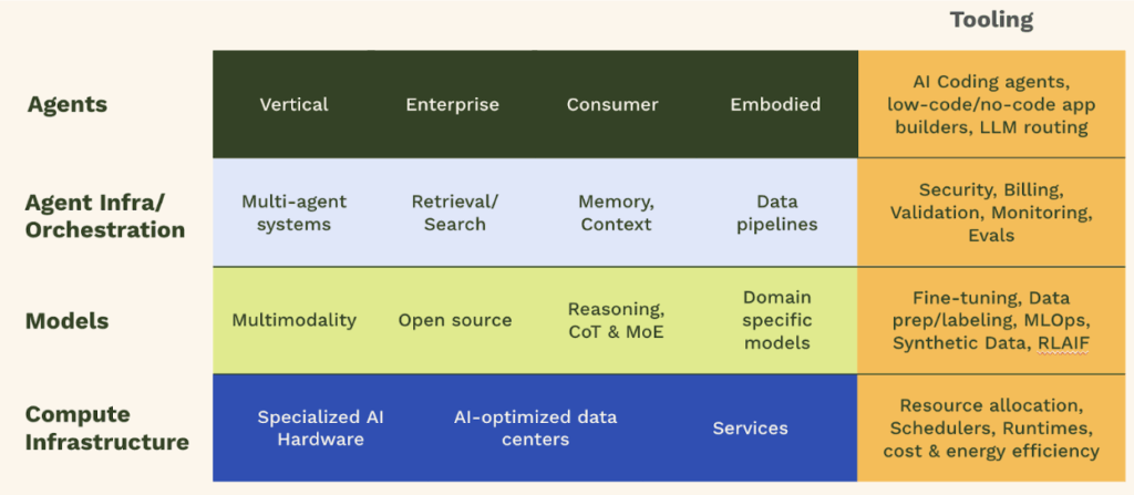 Most of these difficult to build use cases touch many layers of the AI stack with opportunities to innovate at each layer. In a future post, we will delve into some of these opportunities across the following layers:
